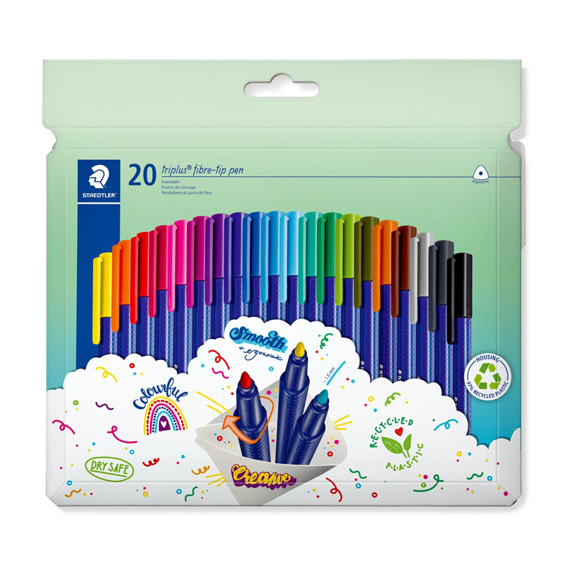 Cutie din carton continand 20 carioci din plastic reciclat, culori asortate.Informatii despre produs:Carioca cu varf din fibra, forma triunghiulara er...