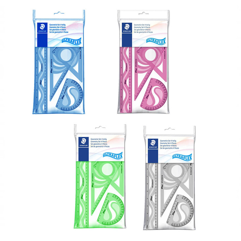 Set geometrie Ultraflex, contine 4 piese realizate din plastic flexibil: 1 rigla, 2 echere (45 grade si 60 grade), 1 raportor. Fiecare piesa este insc...