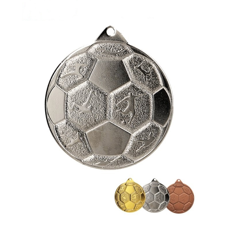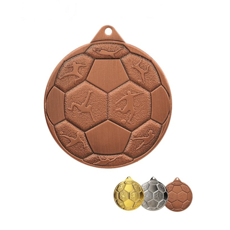 Medalie metalica cu tema fotbal, avand forma unui balon. Diametru: 50 mm (5 cm). Disponibila in trei culori: aur, argint si bronz.